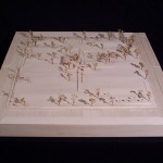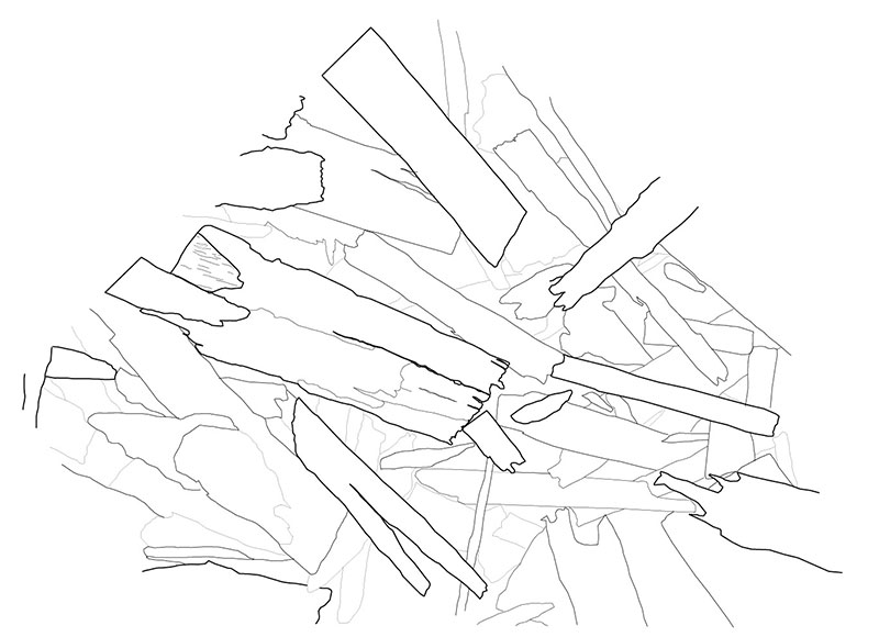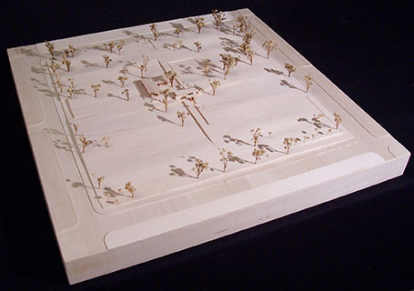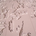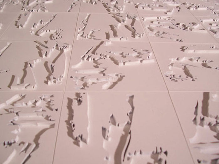 The design process for this project began with a material investigation. My material of choice was oriented strand board (OSB). A set of analyses and drawings were done with digital images and Photoshop, and then translated into a pattern that could be repeated. The pattern was then literally translated into tiles. Through 3D modeling, I discovered the idea of recess and extrusion: solid and void. Once I brought the tiles from digital to physical, the notion of being able to alter the pattern came about. The tiles were set in a frame, but were allowed to freely slide past one another to create different spaces within the patterning.