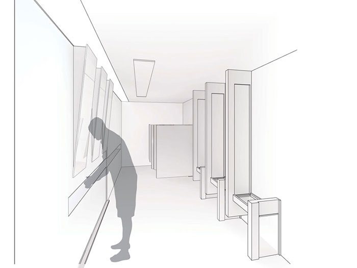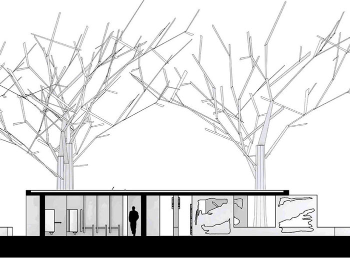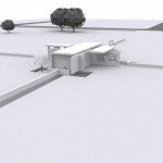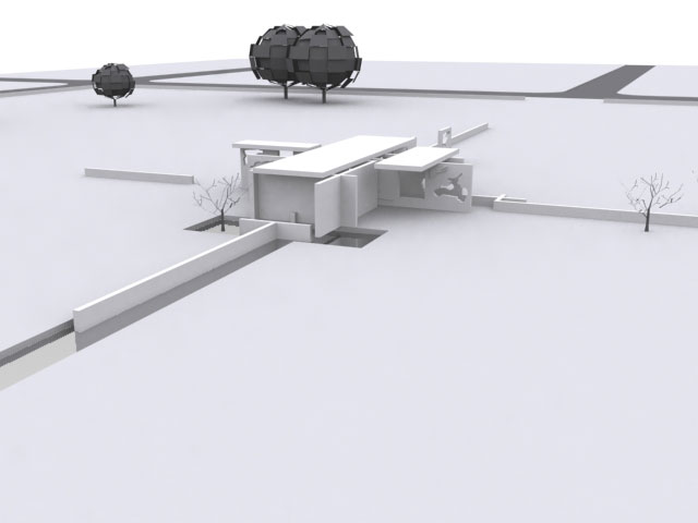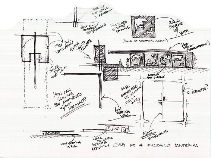 The tiles were then developed into a structure for a local park. Cast concrete panels resemble the tiles made from the OSB analysis on a larger scale. The program included a bathroom, and an adaptable gallery space. The gallery translated the sliding notion to a set of panels that could be re-arranged for different exhibits. Since my project incorporated solids and voids, the sink also used these principles. A space cut through the wall of the bathroom allows space for the user to put his hands through a flowing sheet of water.